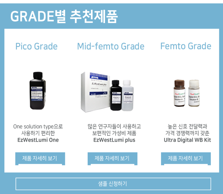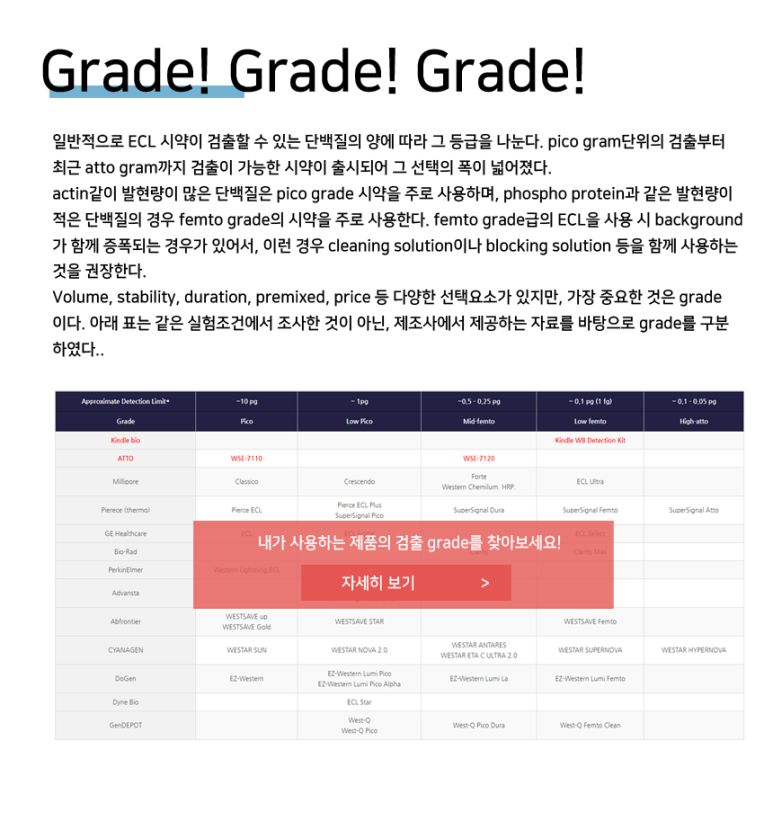 사실 모든 회사에서 더 잘 나온다고 외치고 있지만, 샘플에 따라 무조건 좋은 것을 쓰는 것은 효율성에 맞지 않습니다. Actin같은 거 pico급으로 몇 초만에 나오는데, Femto grade ECL을 반응하면, 바로 타버리는 일이 발생하지요. 그래서 각 브랜드별로 어느정도 급으로 나와 있는지 먼저 살펴봐야 합니다.