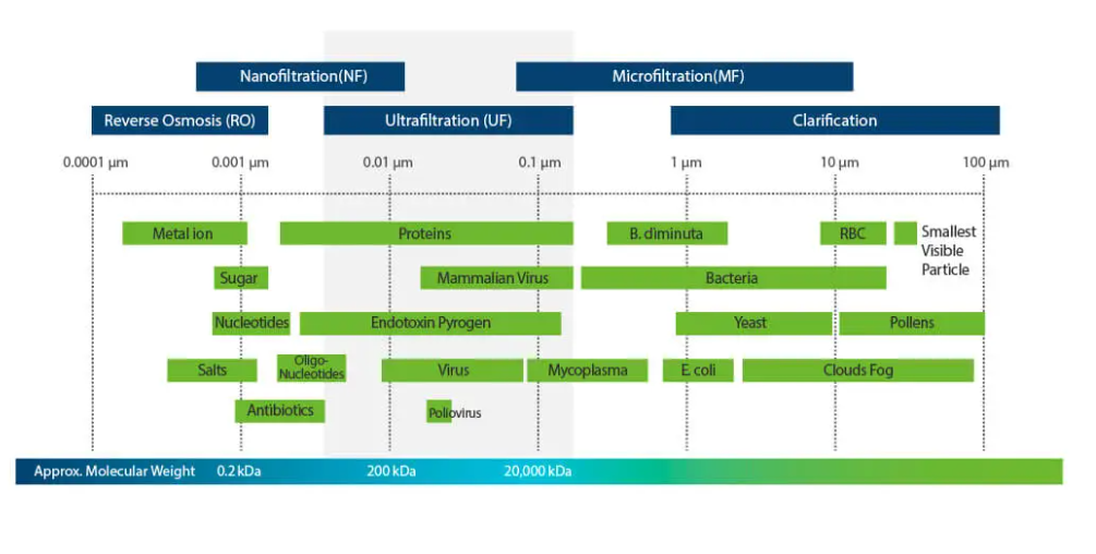 위의 표와 같이 MW에 따라 RO, NF, UF,MF 등과 같이 나눠지는데 단백질이나 바이러스 분리하는데 최적의 분리 방법이 UF이며, 최근에는 exosome을 분리하는데 standard처럼 사용하고 있습니다.